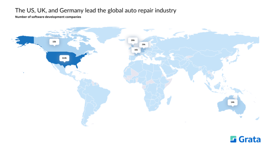 The US, the UK, and Germany are the top three countries in the global auto repair industry. Other heavy hitters in the space include France, Canada, and Australia.