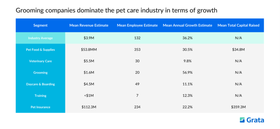 - Private grooming companies are seeing the most growth, with an average rate of 56.9%.