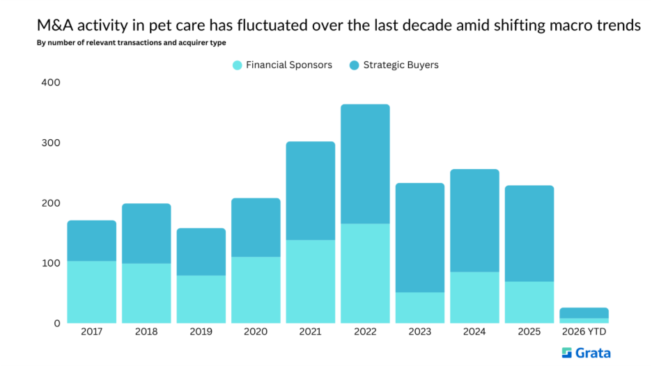 - M&A activity in the pet care industry has fluctuated over the last 10 years amid shifting macro trends, such as pandemic-driven surges in pet adoption, changing consumer behavior, inflation, and tariffs.