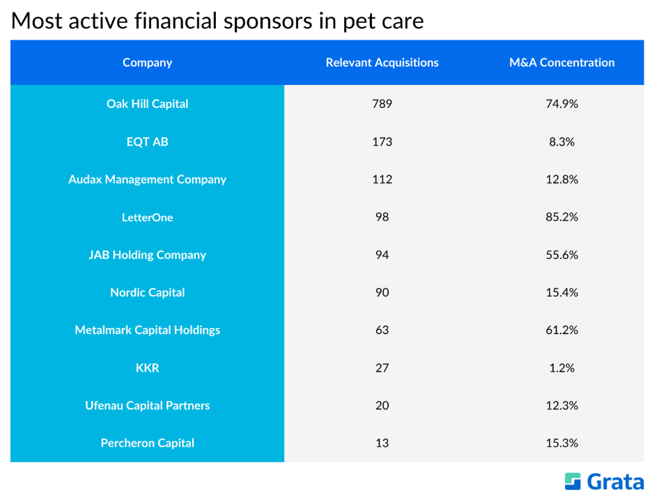 Oak Hill Capital tops the list of the most active financial sponsors in pet care with 789 relevant transactions. Its acquisitions primarily focus on veterinary care facilities.