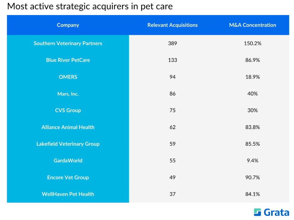 Southern Veterinary Partners is the most active strategic acquirer in the pet care industry, with 389 transactions. Most of its acquisitions have been in the veterinary care services sector.