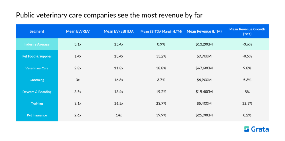 Dealmakers interested in the pet care industry should also consider the training sector. While it accounts for just 9.8% of the broader industry, and pet training companies see under $1M in average annual revenue, the sector is growing at a solid mean rate of 12.3%. Training facilities can also operate on relatively low costs, and they can become profitable quite quickly due to high demand.