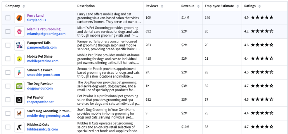 Finding the top companies in the pet grooming industry is quick and easy with Grata. Use our Agentic Search feature to surface companies like these in seconds. Specify the revenue range, employee head count, and more to find the exact companies you’re looking for.