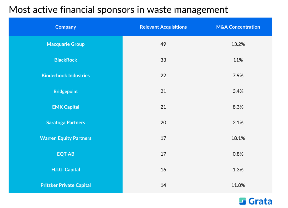 Macquarie Group tops the list of the most active financial sponsors in the waste management industry. Its acquisitions primarily include companies that provide disposal and recycling services for the industrial and commercial sectors.