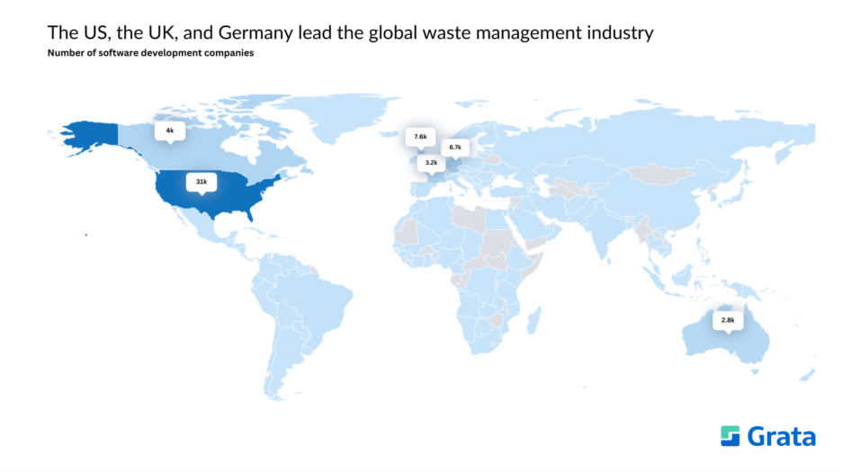 - The US, the UK, and Germany lead the global waste management industry by number of companies.